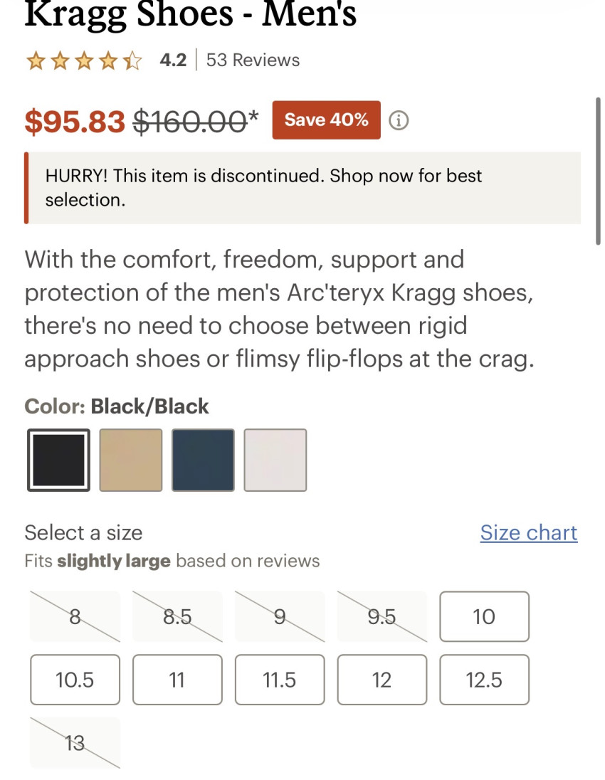 | Outdoors Inc | Arc'teryx Men's Kragg Shoe | $109.99 | 세일 가격 (정상가 $160) |