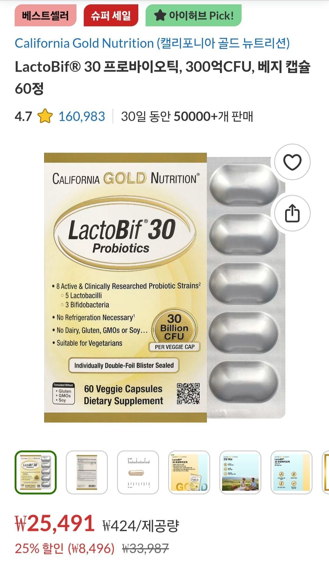 | 아이허브 | CGN락토비프 30 프로바이오틱, 300억CFU, 베지 캡슐 60정 | 25,491원 | 핫딜모음에서 제공한 가격 |