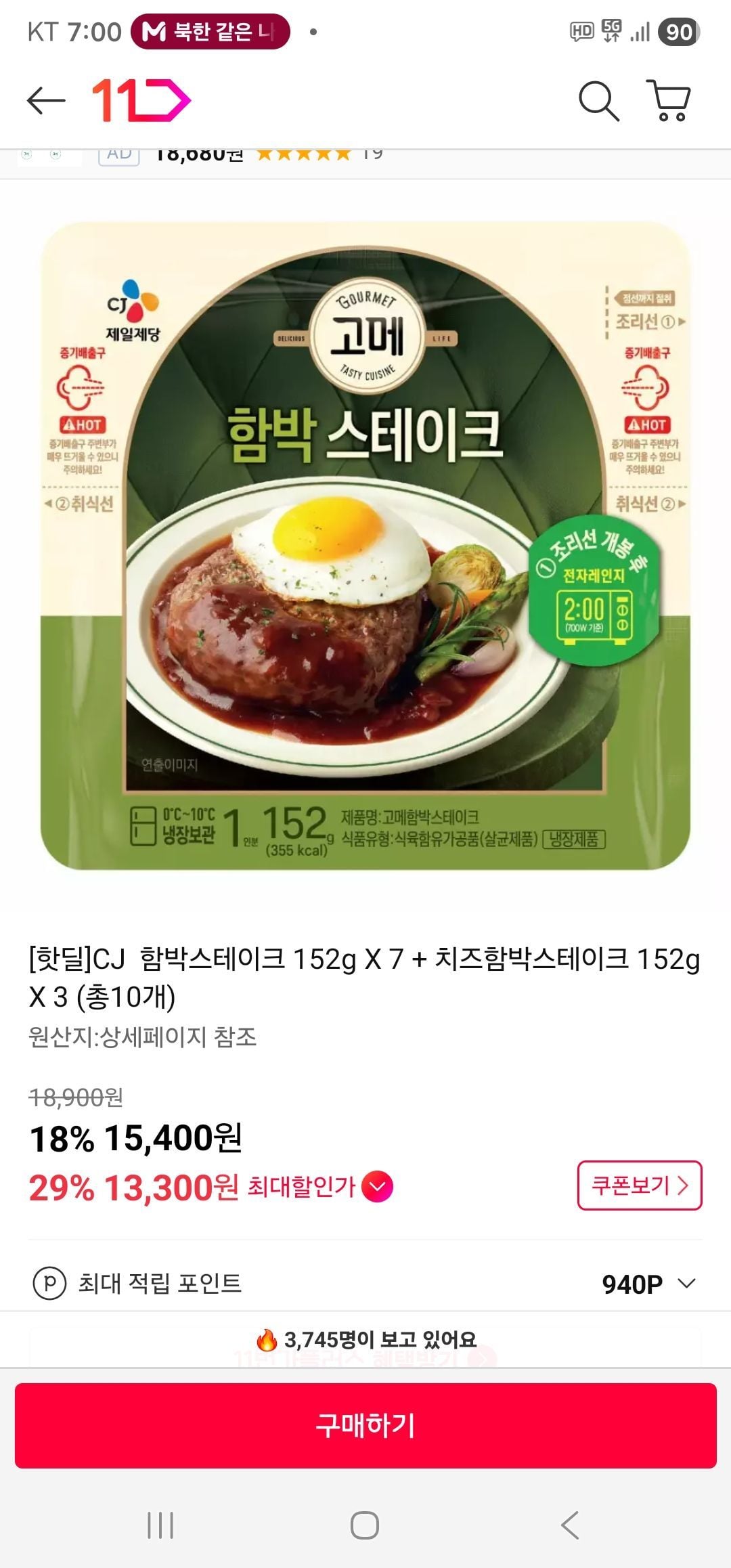 | 헤오닥 | CJ제일제당 고메 함박스테이크 152g x7개+치즈 함박스테이크 152g x3개(총 10개) | 30,900원 | 할인가(원가 46,900원) |