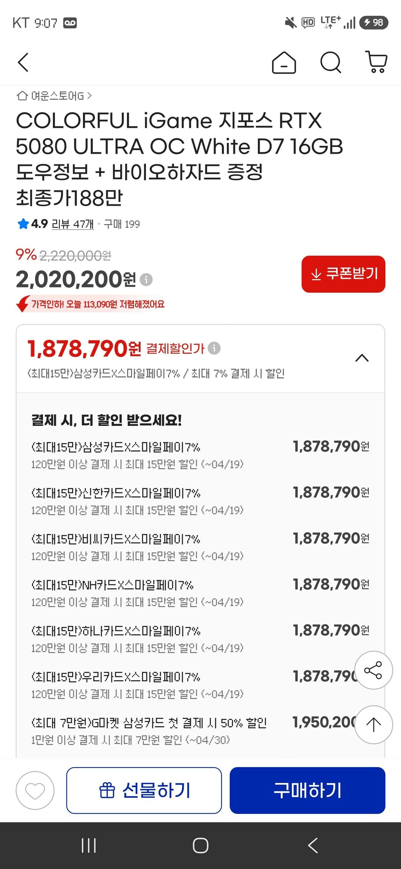 | 이마트 | COLORFUL iGame 지포스 RTX 5080 ULTRA OC White D7 16GB 피씨디렉트 | 1,879,000원 | 최대혜택가 1,709,890원 가능 |