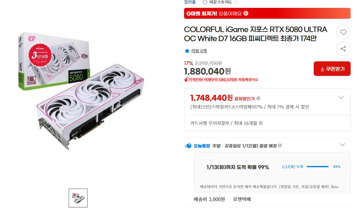 | G마켓 | COLORFUL iGame 지포스 RTX 5080 ULTRA OC White D7 16GB 피씨디렉트 | 1,748,440원 | 핫딜모음에서 제공한 가격 |