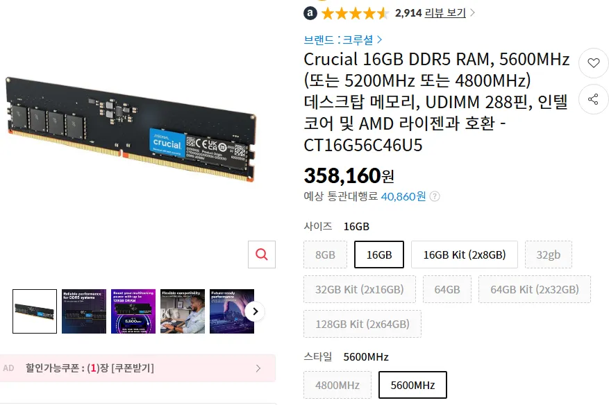 | 다나와 | 마이크론 Crucial DDR5-5600 CL46 (16GB) | 357,790원 | G마켓 최저가 (배송비 2,500원 별도) |