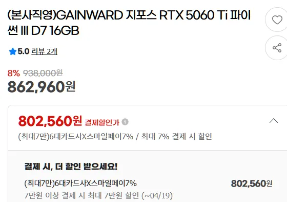 | 롯데하이마트 | GAINWARD 지포스 RTX 5060 Ti 파이썬 III D7 16GB | 769,940원 | 정상가, 최대혜택가 708,340원 |
