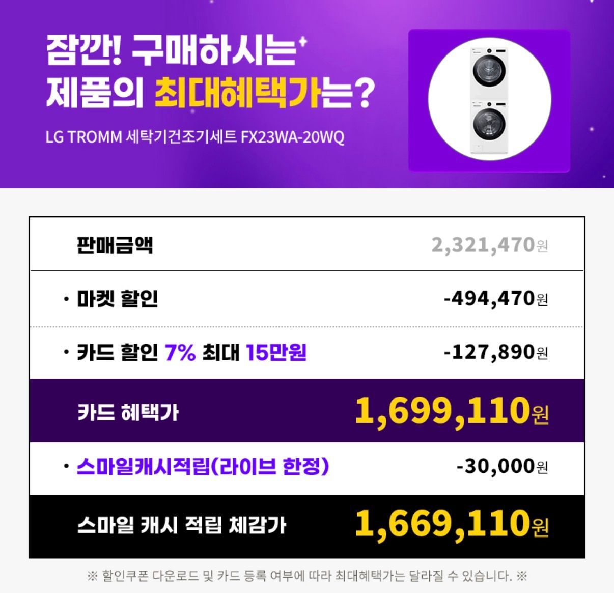 | 하이마트 | 트롬 세탁기+건조기 세트 FX23WA-20WQ (FX23WNA + RD20WSQ) | 3,724,560원 | 표시가는 기본가, 10% 할인 적용 시 최대혜택가 약 3,538,330원 |