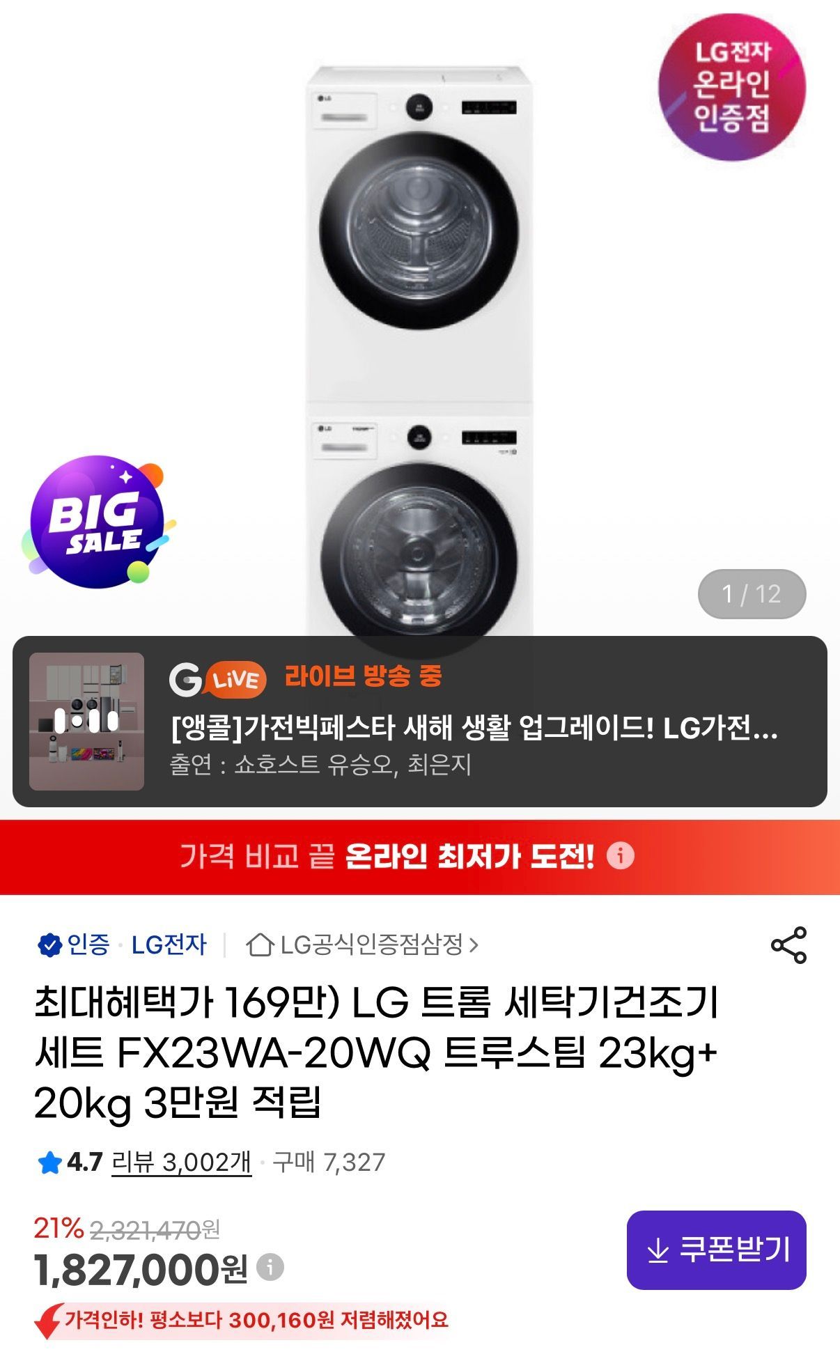 | lgsj.co.kr | LG 트롬 세탁기+건조기 세트 FX23WA-20WQ | 2,279,000원 | 제조사 직영몰, 구독 서비스 이용 가능 가격 |