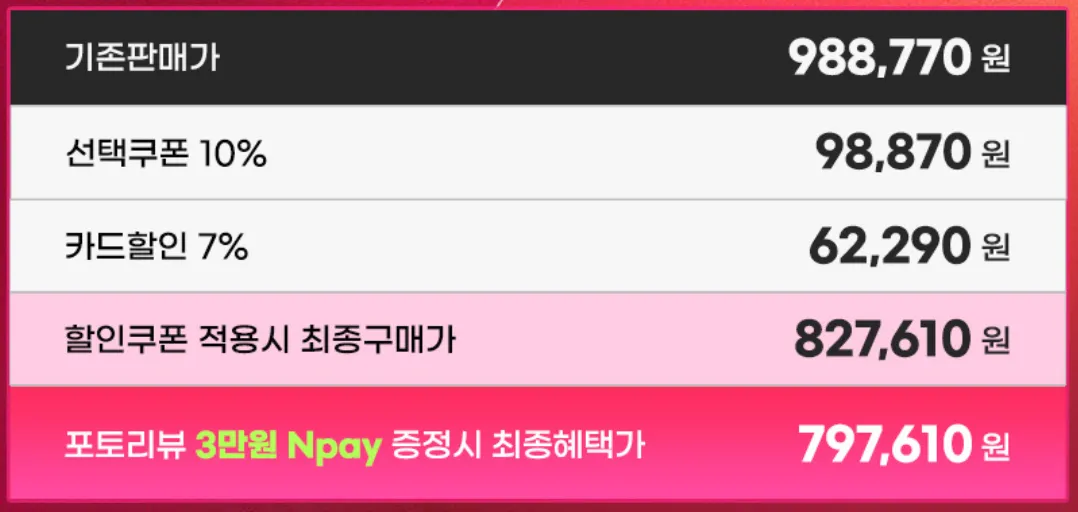 G마켓 827,610원이 가장 저렴하며 강력 추천, 다른 사이트 대비 20-30% 이상 할인된 가격.