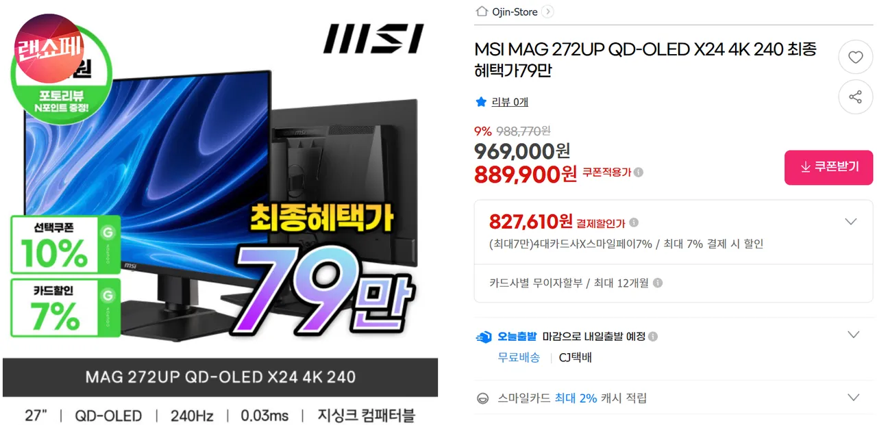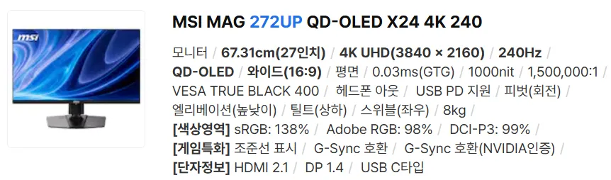 📦 MSI MAG 272UP QD-OLED X24 4K 240Hz 체감가 76만