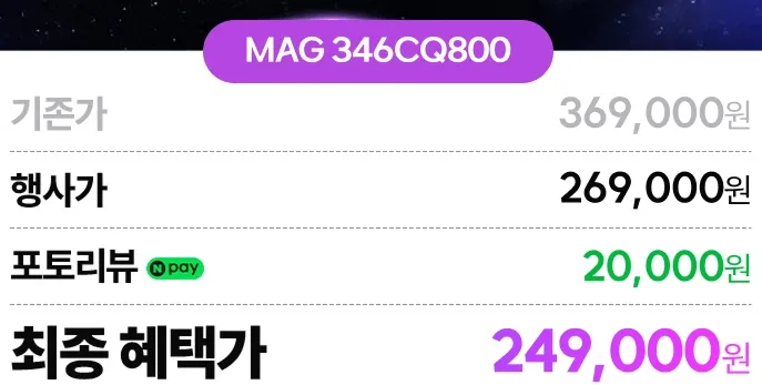 | 네이버쇼핑 | MSI MAG 346CQ800 커브드 모니터 WQHD 모니터 34인치 180Hz | 249,000원 | 핫딜모음에서 제공한 가격 |