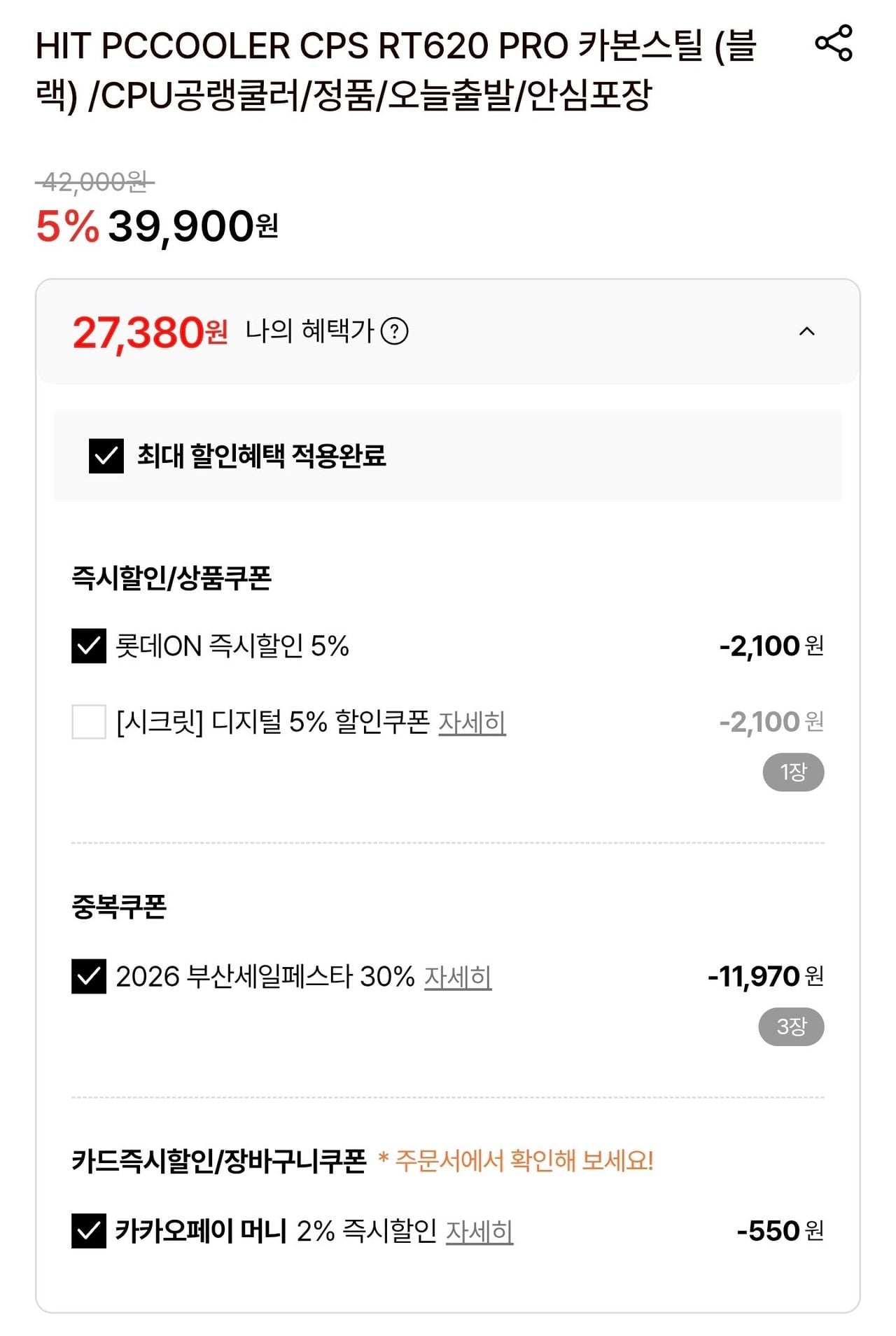 | 롯데온 | PCCOOLER CPS RT620 PRO 카본스틸 (27,930원/2,500원) | 27,930원 | 핫딜모음에서 제공한 가격 |