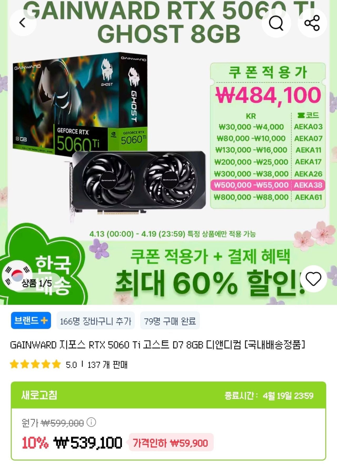 | AliExpress | RTX 5060 Ti 고스트 D7 8GB 디앤디컴 국내배송정품 | 476,666원 | 핫딜모음에서 제공한 가격 |