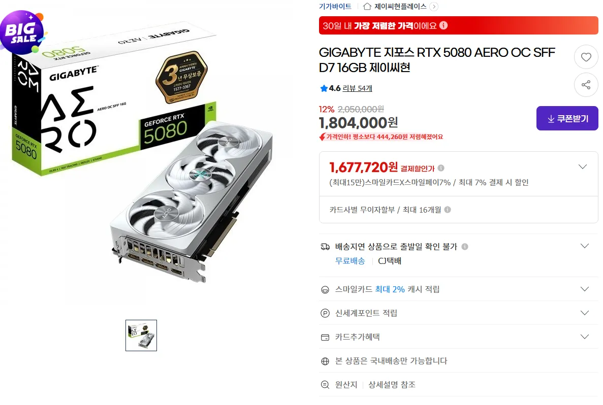 | 하이마트 | 기가바이트 지포스 RTX 5080 AERO OC SFF D7 16GB 제이씨현 | 1,999,780원 | 일반 판매가 기준, 카드 추가할인 시 최대혜택가 별도 |