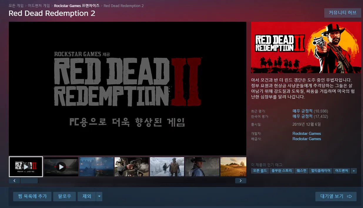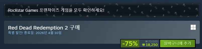 | 스팀 | Red Dead Redemption 2 | 18,250원 | 핫딜모음에서 제공한 가격 |