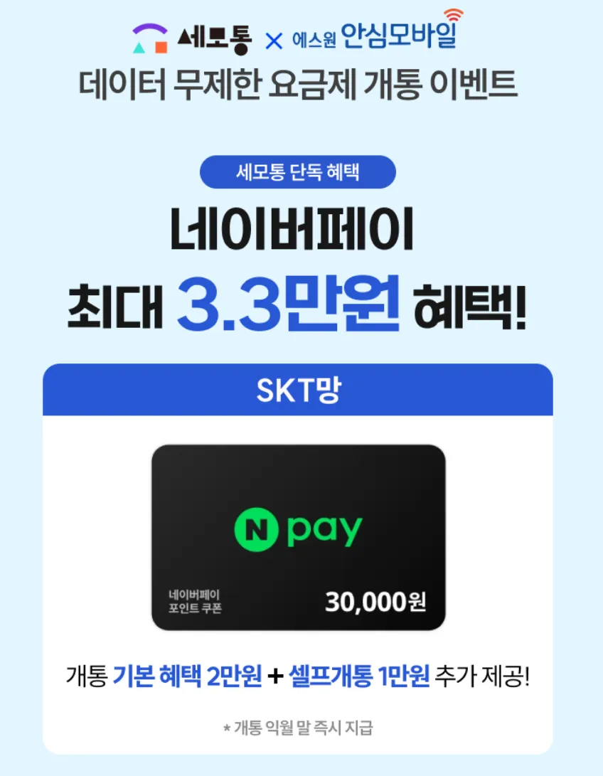 네이버페이 최대 3.3만원 = 기본2만 + 셀프개통 1만 + 세모통 3천