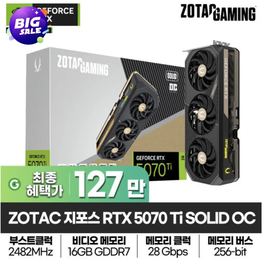 | 11번가 | ZOTAC GAMING 지포스 RTX 5070 Ti SOLID OC D7 16GB | 1,412,650원 | 무료배송 |