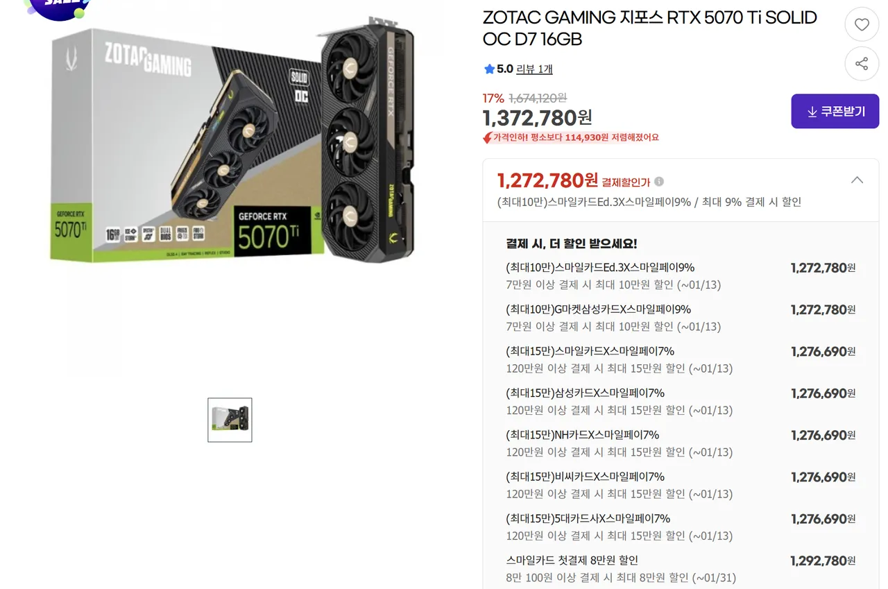 | 11번가 | ZOTAC GAMING 지포스 RTX 5070 Ti SOLID OC D7 16GB | 1,412,650원 | 11번가 최저가 검색 결과(배송비 무료) |