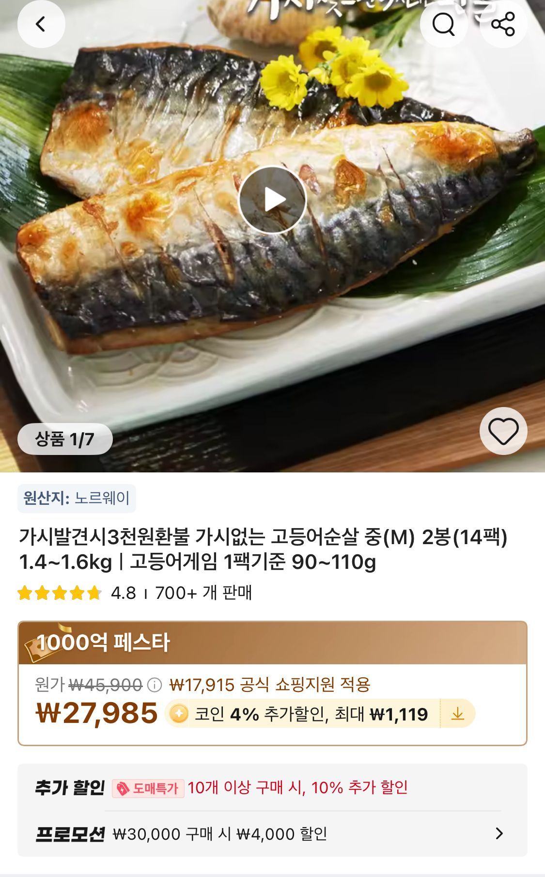 | 알리 | 가시없는 고등어순살 중(M) 2봉(14팩) 1.4~1.6kg | 26,865원 | 핫딜모음에서 제공한 가격 |