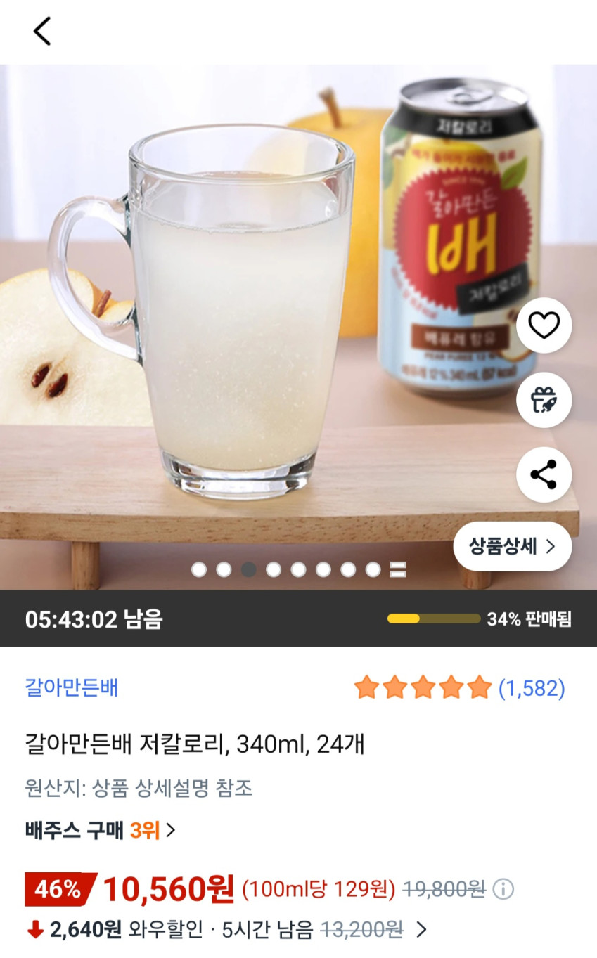 | 쿠팡 | 갈아만든배 저칼로리, 340ml, 24개 | 10,560원 | 핫딜모음에서 제공한 가격 |