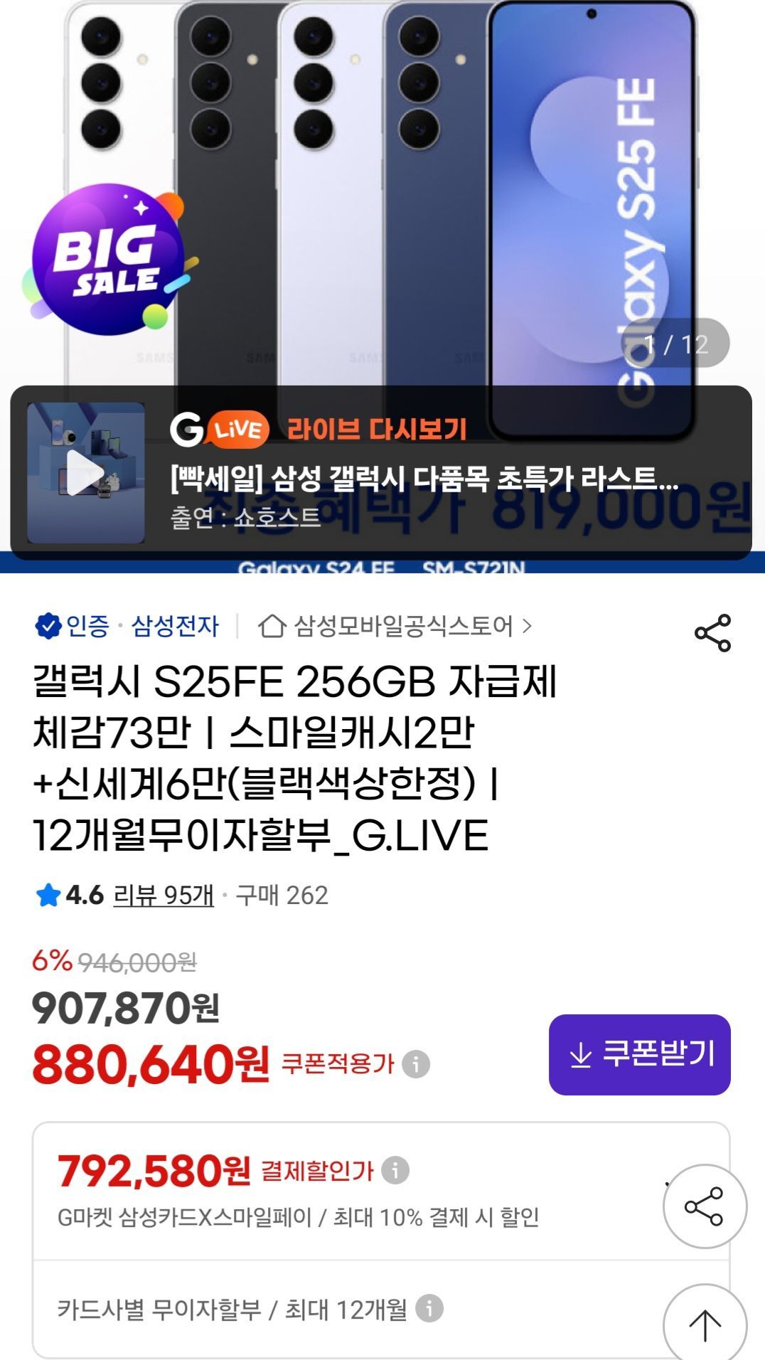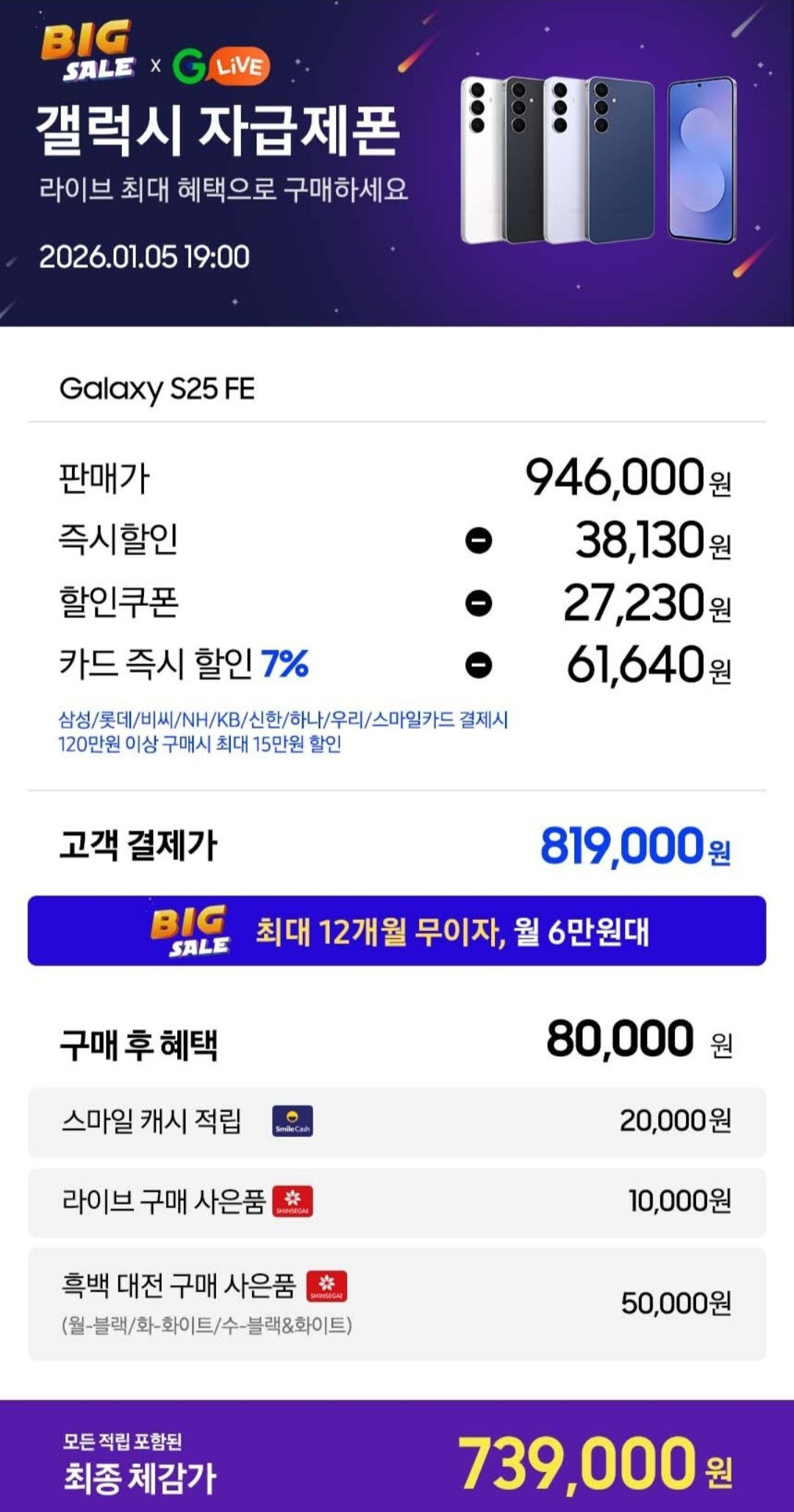 갤25FE 스마일캐시 2만 + 신세계상품권 6만 체감가 73.9만원