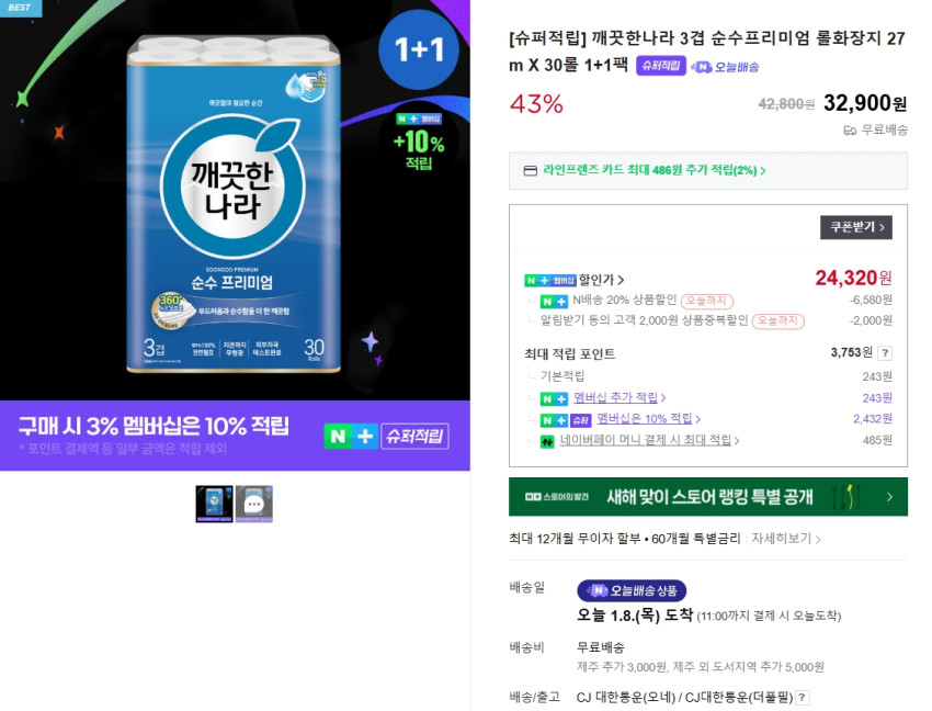 | 쿠팡 | [광폭 108mm]크리넥스 3겹 울트라클린 와이드 롤화장지 33MX24롤X2팩 | 57,560원 | 동일 규격(광폭108mm 33M 24롤 2팩) |