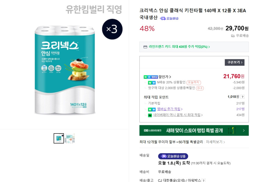 | 네이버 | 광폭108mm 크리넥스 3겹 울트라클린 화장지 33MX24롤X2팩 | 27,520원 | 핫딜모음에서 제공한 가격 |
