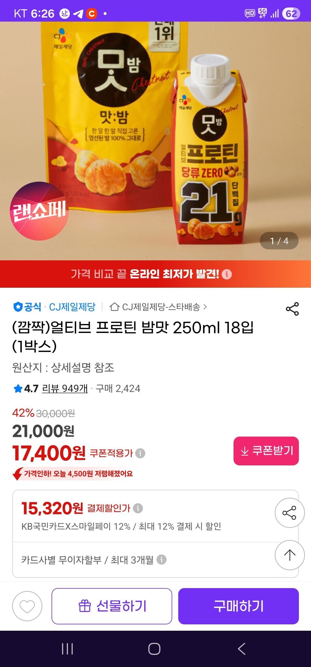 | 지마켓 | 국카) 얼티브 프로틴 밤맛 250ml 18입 | 15,320원 | 핫딜모음에서 제공한 가격 |