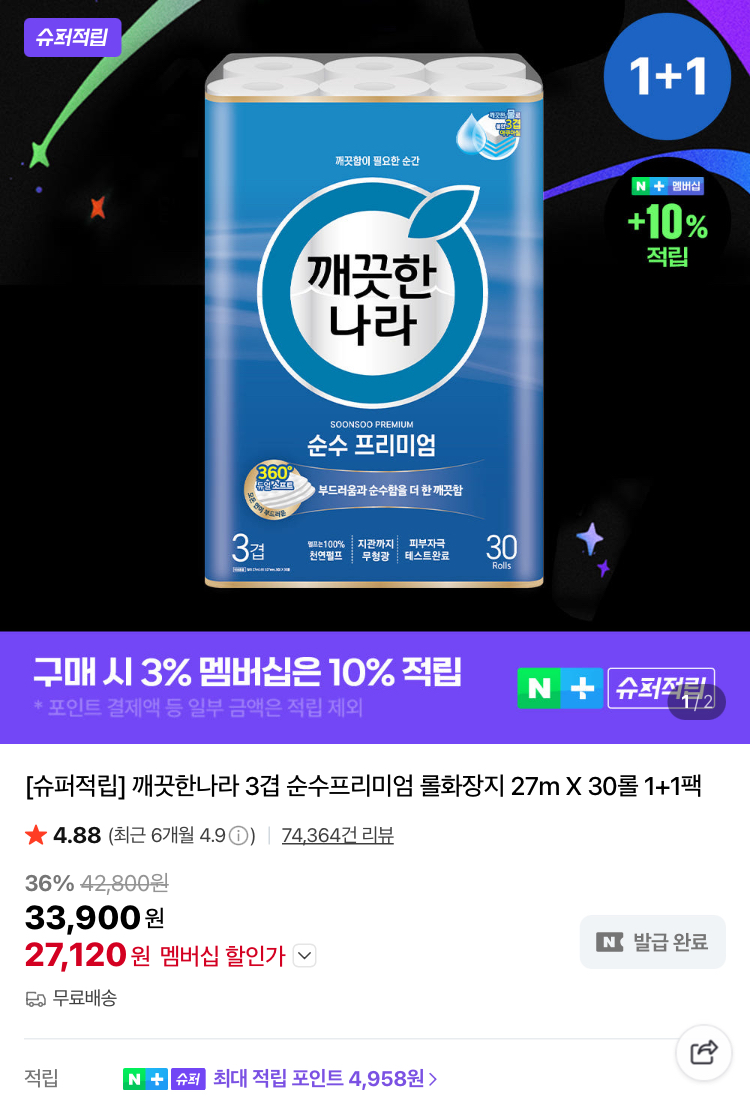 | 네이버 | 깨끗한나라 3겹 순수프리미엄 휴지 27mX30롤 2팩 | 27,120원 | 핫딜모음에서 제공한 가격 |