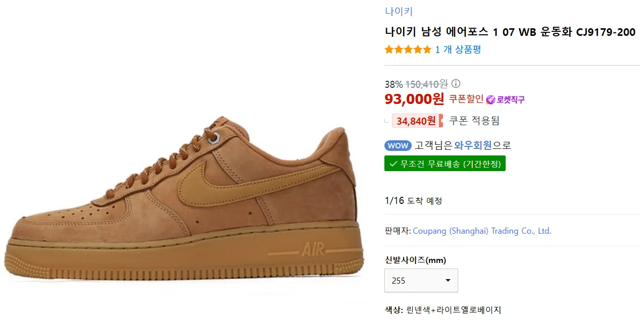 | 쿠팡 | 나이키 남성 에어포스 1 07 WB | 93,000원 | 핫딜모음에서 제공한 가격 |