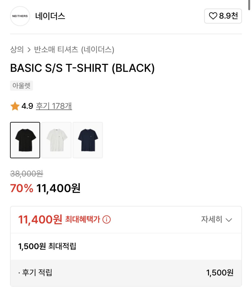 | 무신사 | 네이더스 베이직 반팔티 | 11,400원 | 핫딜모음에서 제공한 가격 |