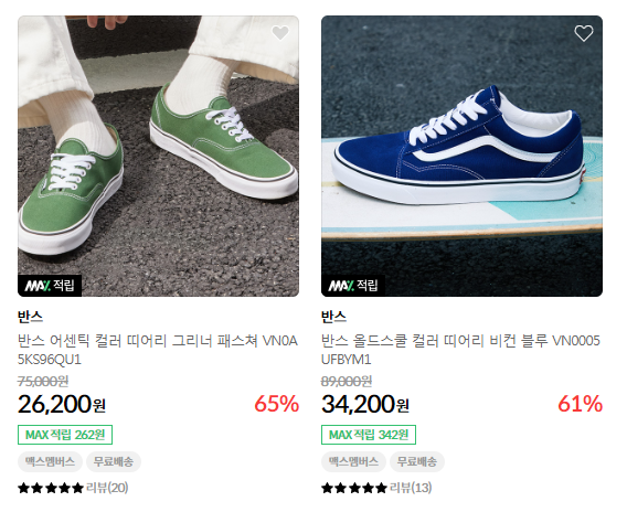 | 11번가 | VANS 남여공용 스니커즈 균일가 12종 택 1 | 31,920원 | 반스 균일가 스니커즈, 18% 할인, 배송비 무료 |