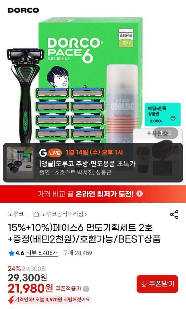 | 지마켓 | 도루코 페이스6 면도기획세트 기+날13+폼+배민2천 | 21,980원 | 핫딜모음에서 제공한 가격 |