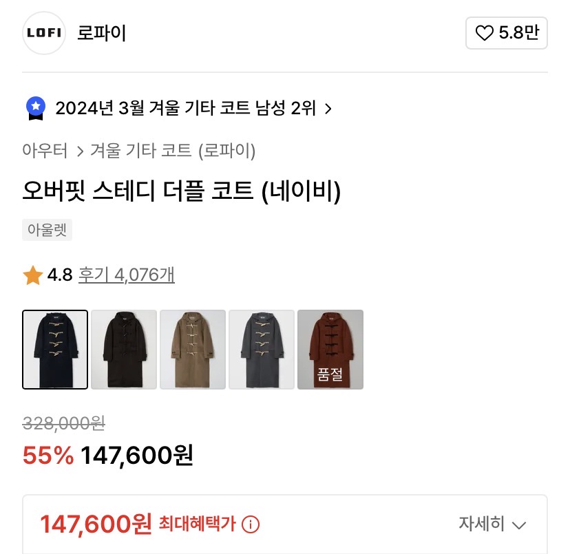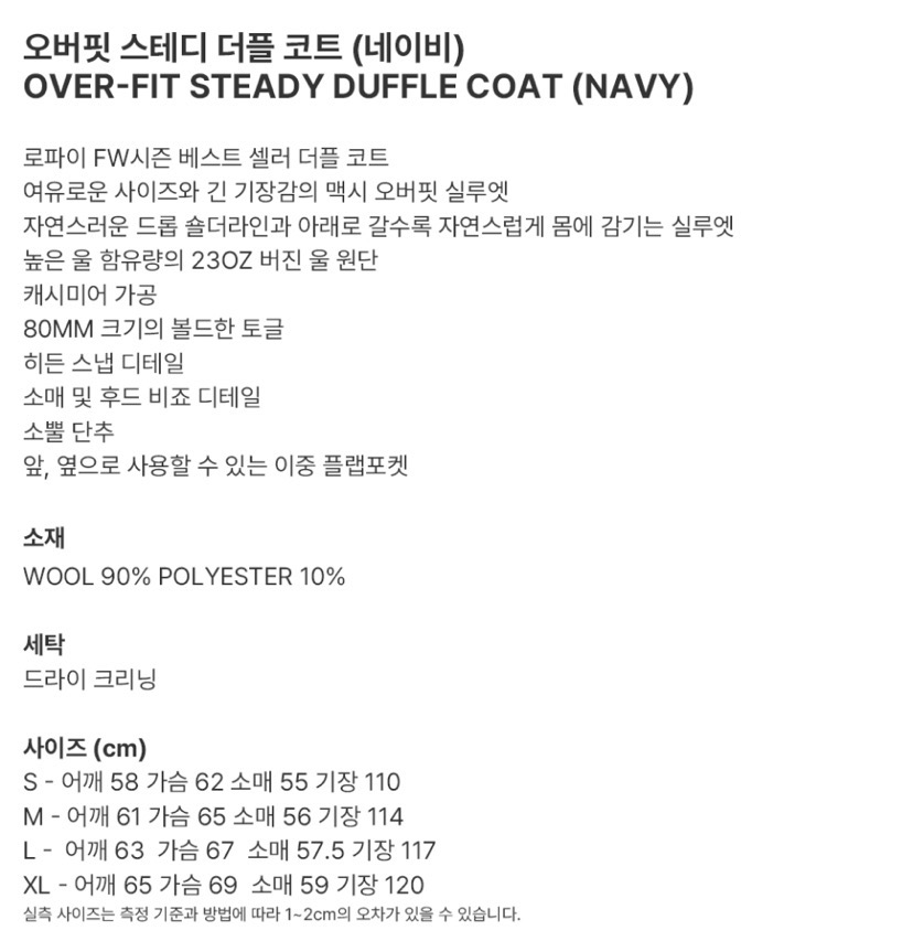 | 로파이 | 로파이 오버핏 스테디 더플 코트 (네이비) | 229,600원 | |