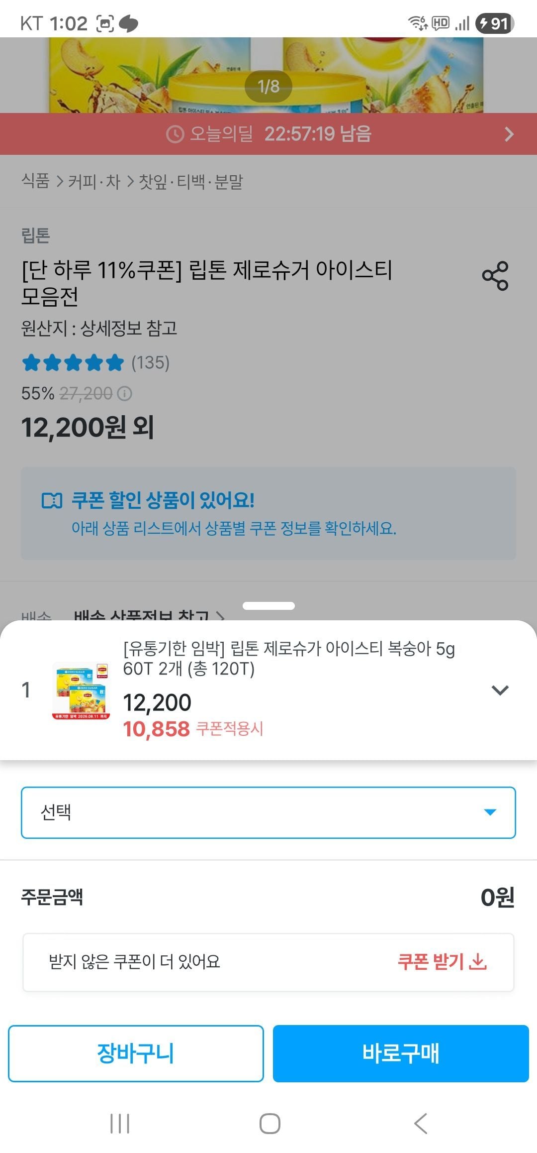 | 호뜨딜 | 립톤 아이스티 제로슈가 복숭아 60T | 13,900원 | 30% 할인, 2개 구매시 추가 쿠폰 가능, 단일 팩 |