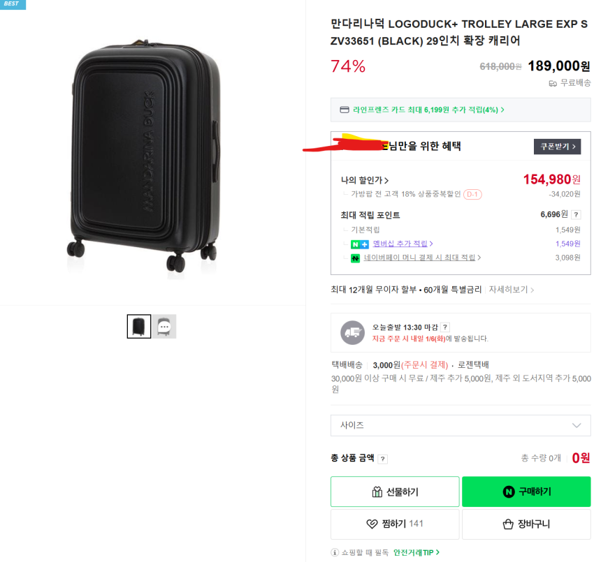 | 네이버 스마트스토어 | 만다리나덕 29인치 확장형 캐리어 | 154,980원 | 핫딜모음에서 제공한 가격 |