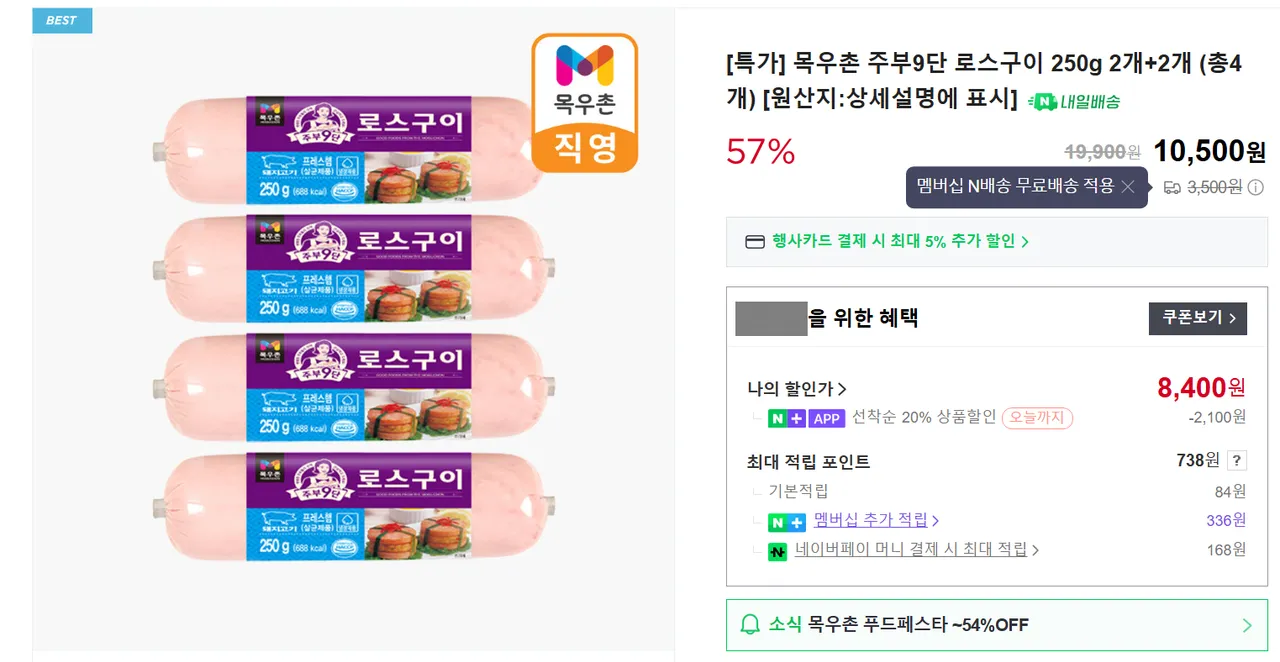| 네이버 | 목우촌 주부9단 로스구이 250g 2개+2개 (총4개) | 8,400원 | 핫딜모음에서 제공한 가격 |