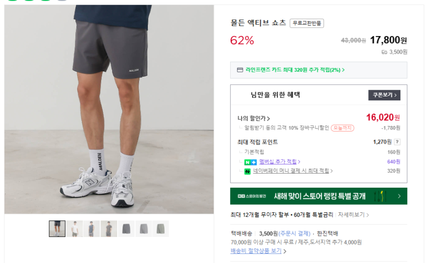 | 몰든 공식 온라인 스토어 | 액티브 쇼츠 (Black) | 28,800원 | 블랙 색상, 정가 43,000원에서 33% 할인 |