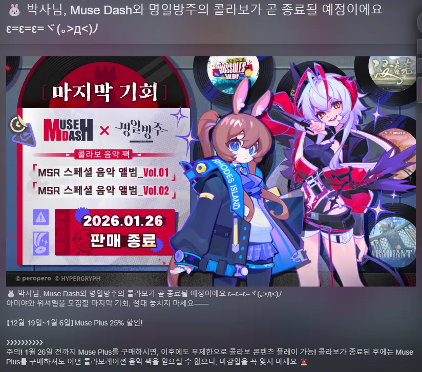 콜라보 종료하기 전에 DLC 구매해야 명일방주 음악이랑 캐릭터 사용 가능