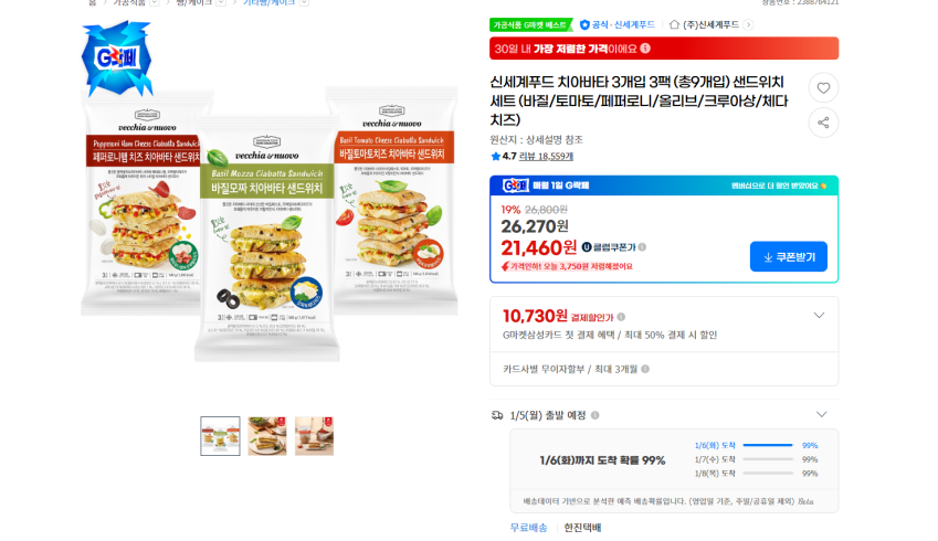 | 11번가 | 베키아에누보 바질모짜 치아바타 샌드위치 3팩(총 9개) | 26,900원 | 할인율 25%, 배송비 무료 |