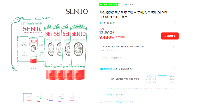 | 오늘의집 | 센토 프라임 고불소 구취케어/잇몸케어/블랙차콜 치약 3종 120g 4개 + 치약 2개 증정 | 12,900원 | 다양한 종류 4개 + 증정품 2개 |
