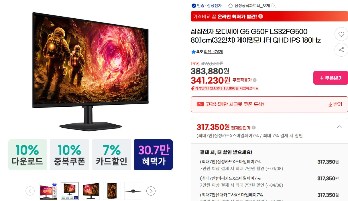 | 쿠차(쿠팡) | 삼성 오디세이 G5 32인치 | 328,990원 | 최저가 검색 결과 |