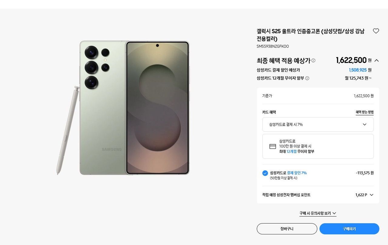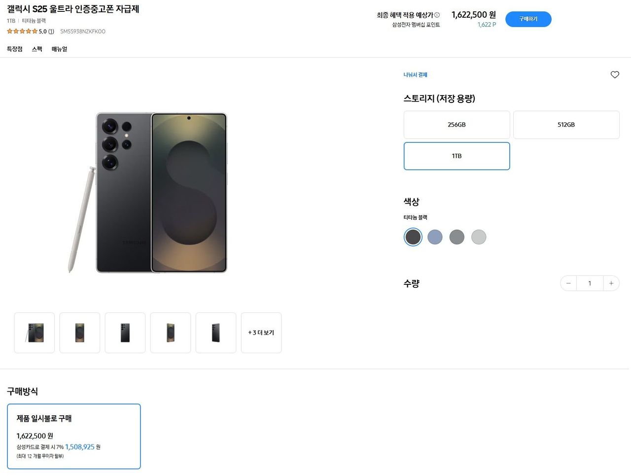 | 삼성닷컴 | (삼성 인증 중고폰) 갤럭시 s25 울트라 자급제 1테라 | 1,508,925원 | 핫딜모음에서 제공한 가격 |