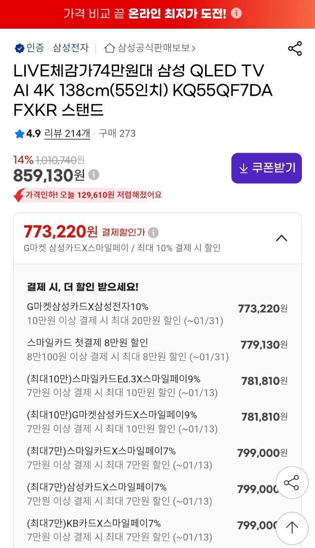 현시점 55인치 머기업 QLED중에선 가장싼 80아래 79만원대 80아래는 첨이라는거같고