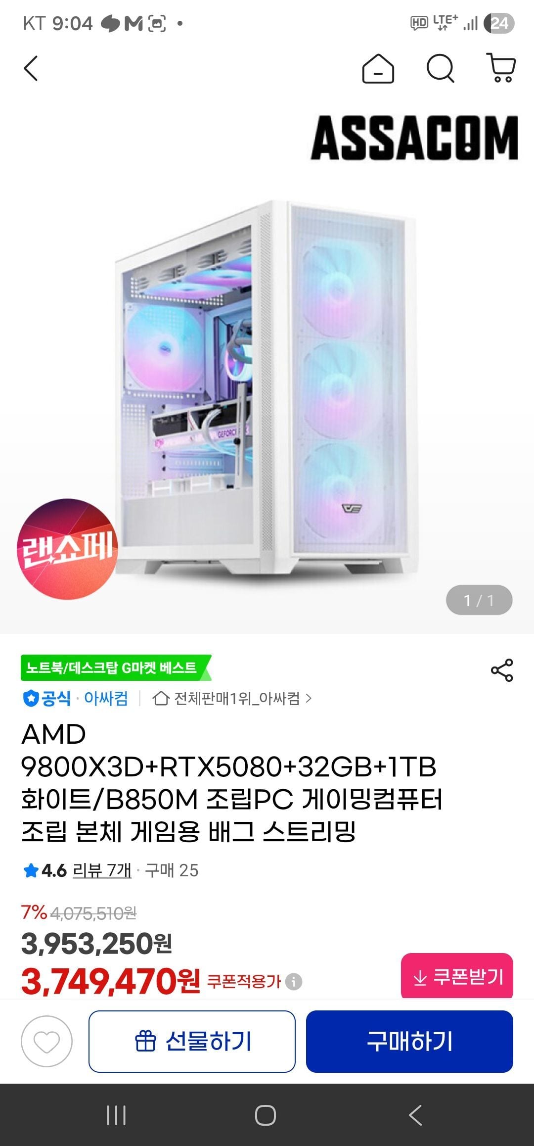 G마켓삼카) 9800X3D+RTX5080+32GB+1TB 화이트 게이밍컴퓨터3,599,470원핫딜모음핫딜모음에서 제공한 가격