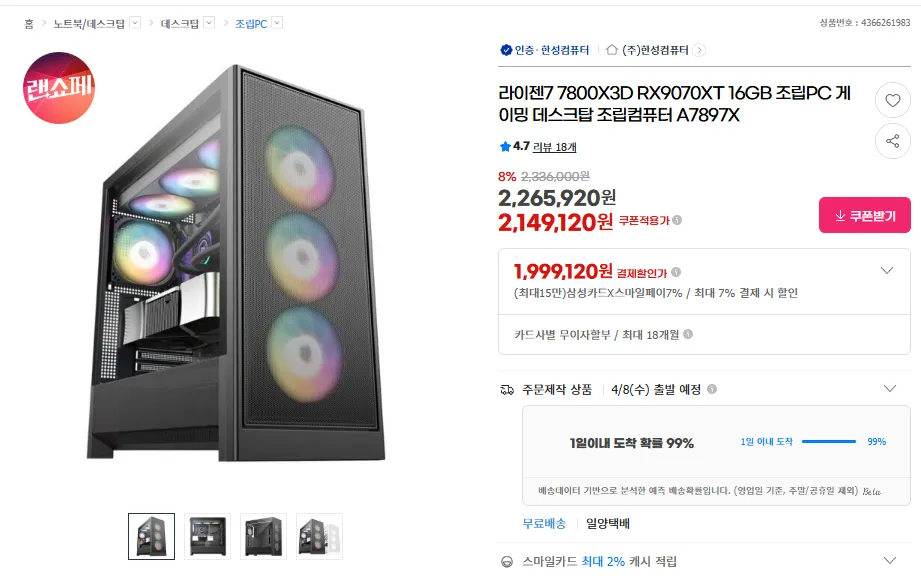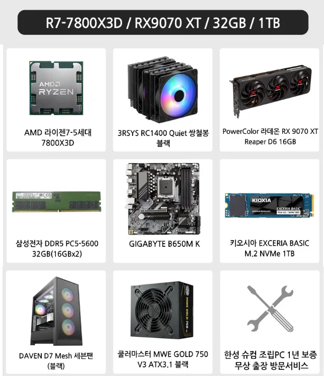| 슈퍼스토어 | 라이젠7 7800X3D RX9070XT 16GB 조립PC 게이밍 데스크탑 조립컴퓨터 A7897X | 2,599,000원 | 5% 할인 적용 가격 |