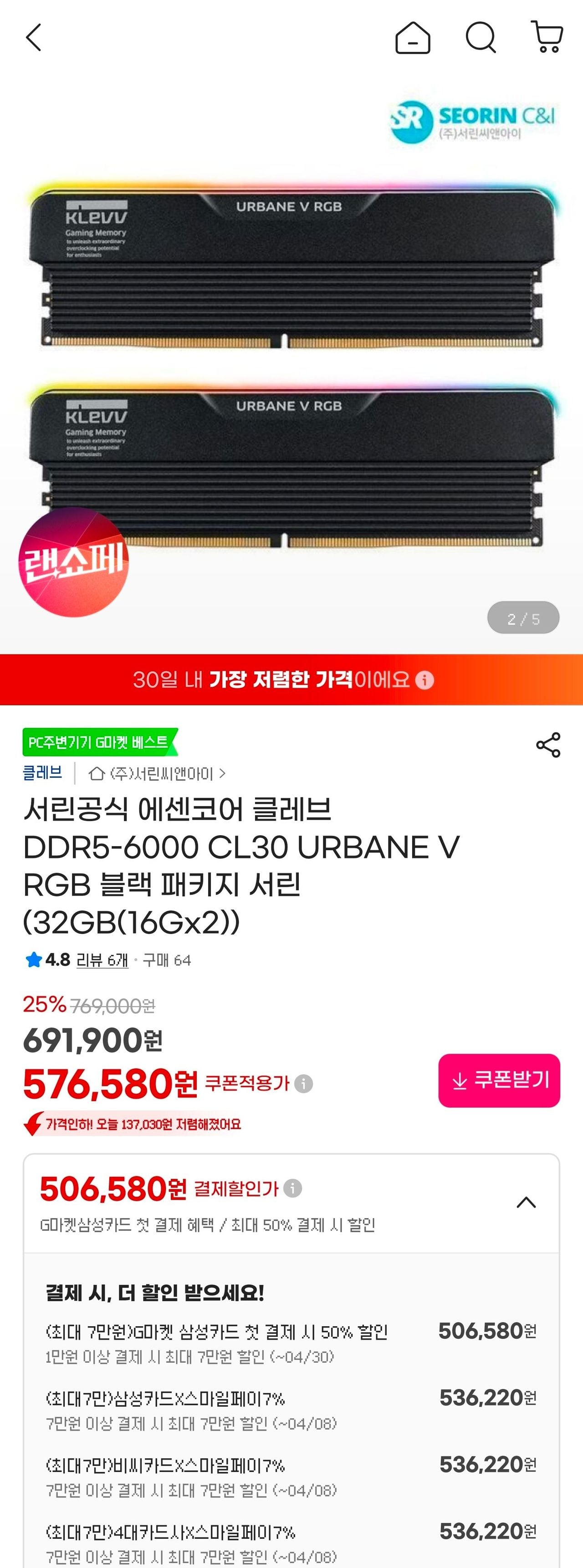 | 지마켓 | 서린공식 에센코어 클레브 DDR5-6000 CL30 URBANE V RGB 블랙 패키지(32GB(16Gx2)) | 536,220원 | 핫딜모음에서 제공한 가격 |