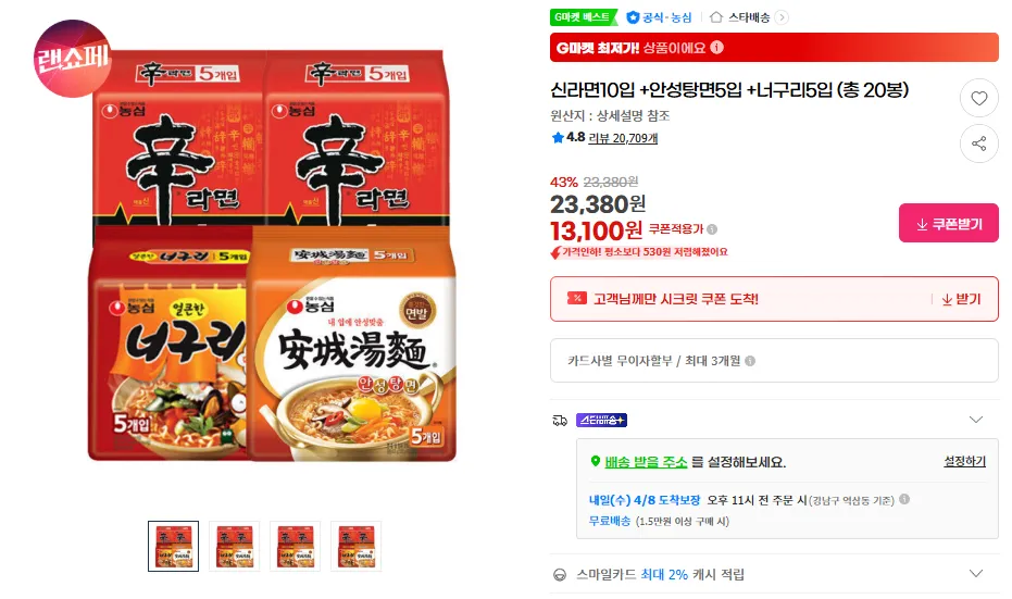 G마켓신라면10입 +안성탕면5입 +너구리5입 (총 20봉)13,100원핫딜모음핫딜모음에서 제공한 가격