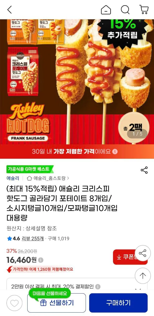| G마켓 | 애슐리 크리스피 핫도그 골라담기 포테이트 8개입/소시지탱글10개입/모짜탱글10개입 | 16,460원 | 핫딜모음에서 제공한 가격 |