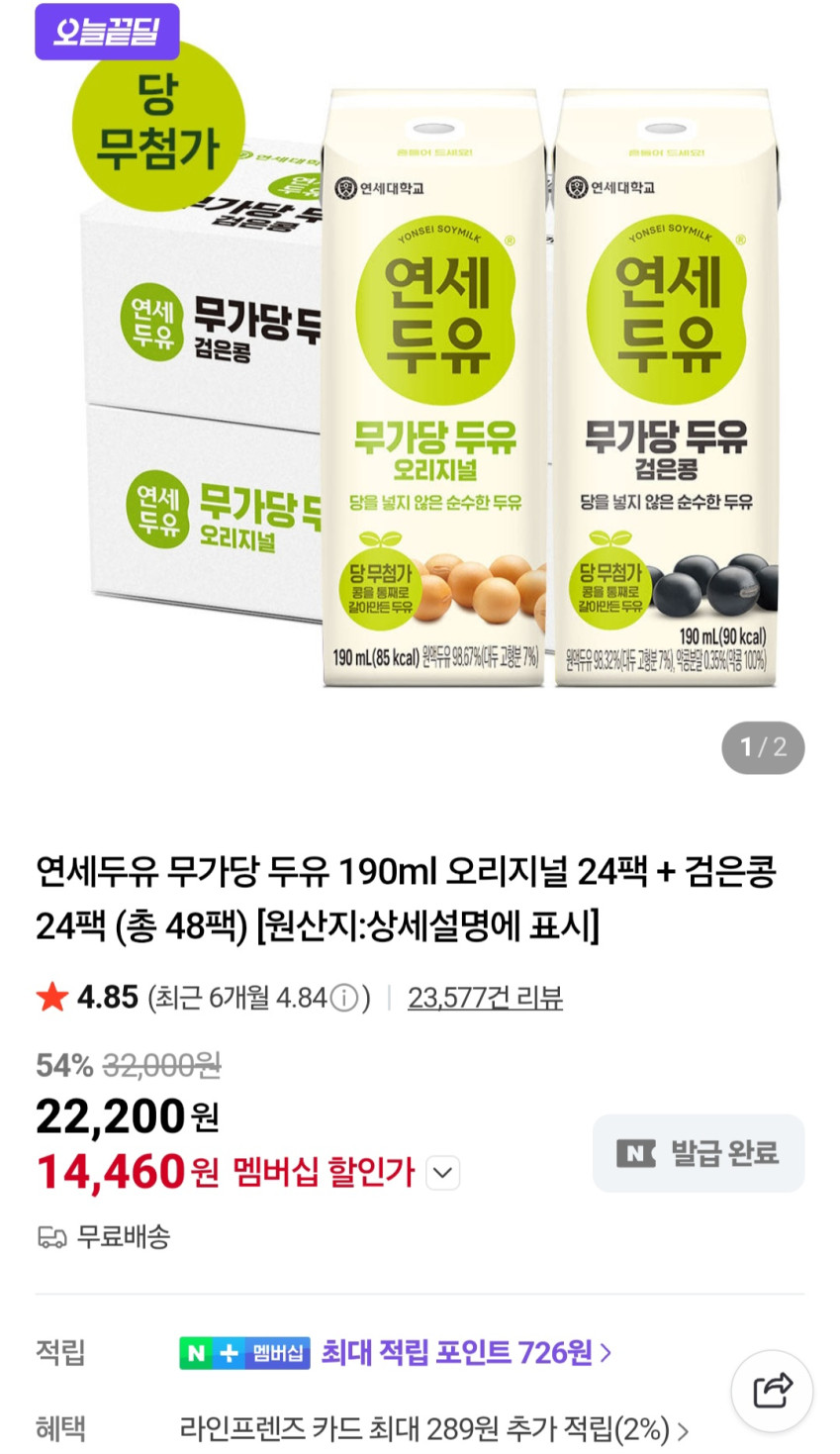 | 네이버 | 연세두유 무가당두유 190ml 24팩 + 검은콩 190ml 24팩 | 14,460원 | 핫딜모음에서 제공한 가격 |