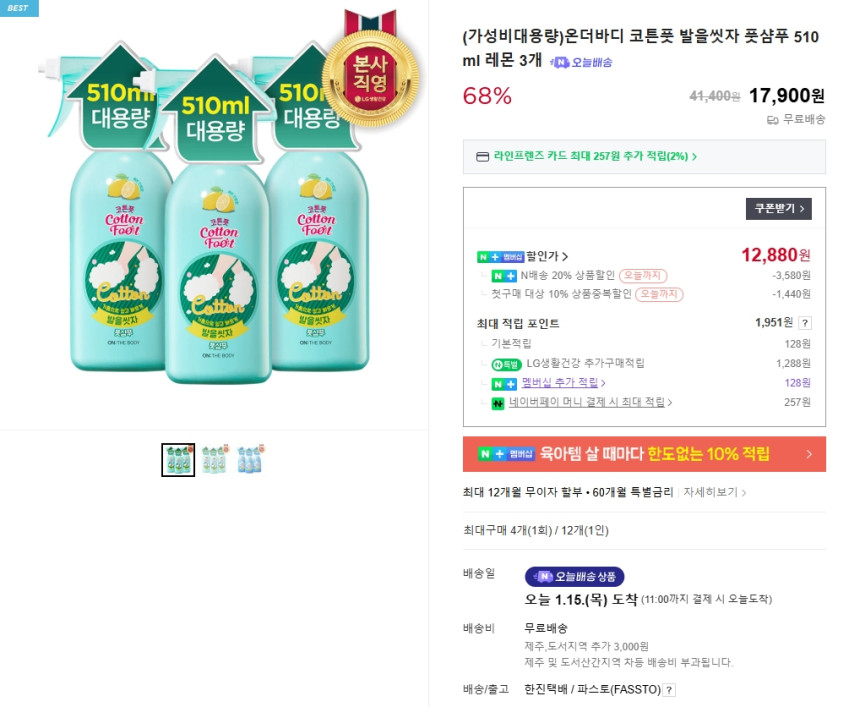 | 컬리 | [온더바디] 발을씻자 코튼풋샴푸 대용량 510ml 3종 (택1) | 6,050원 | 56% 할인, 3종 택1 (단품 가격) |