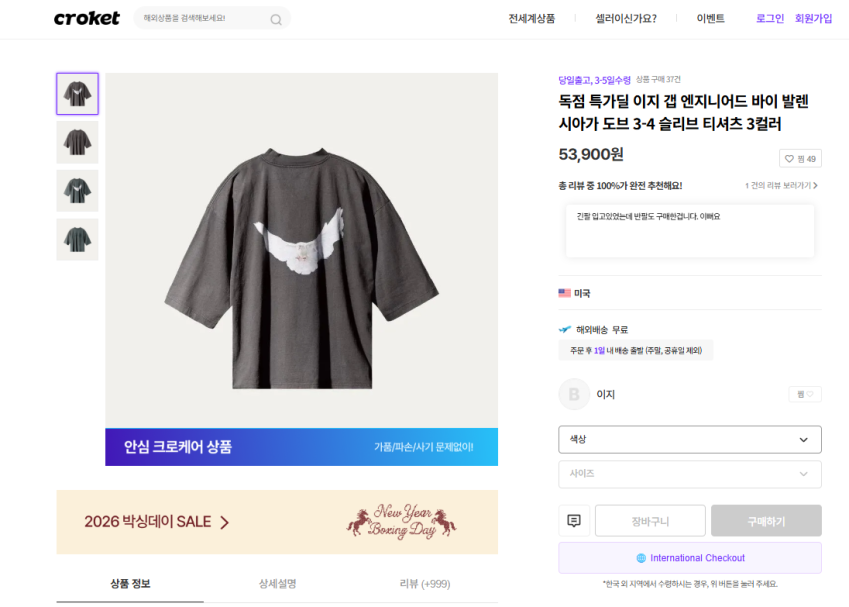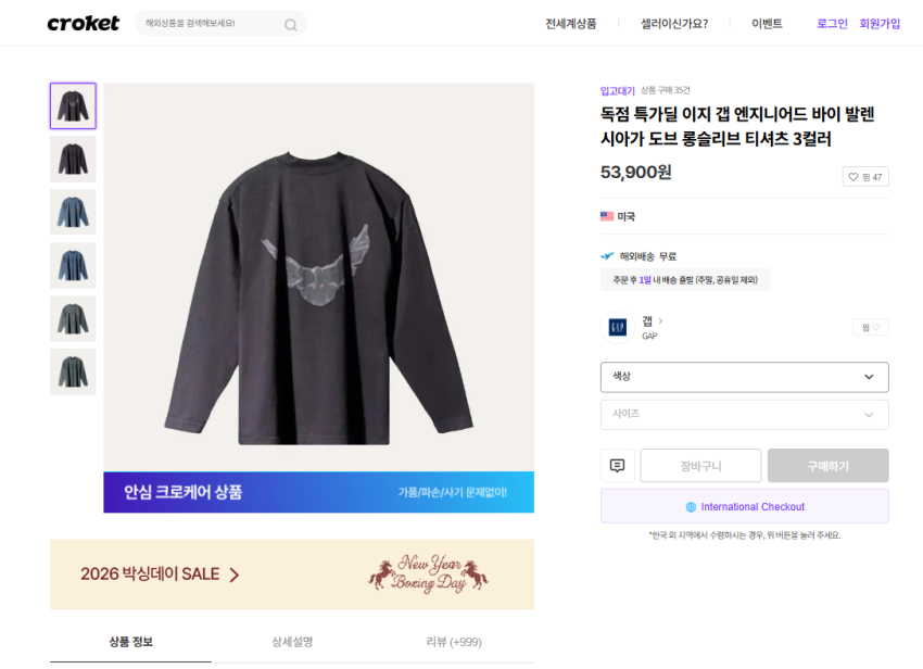 | 크림 (Kream) | 이지 갭 엔지니어드 바이 발렌시아가 도브 롱슬리브 티셔츠 워시드 블랙 | 70,000원 (XS 기준) | 최저가 L 20,000원, 평균 82,000원 |