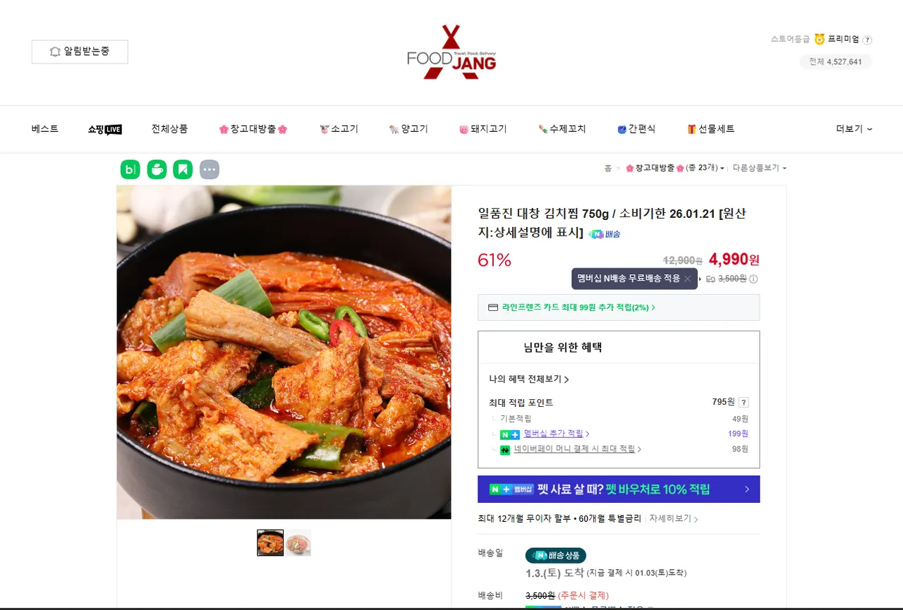 | foodjang | 일품진 대창 김치찜 750g (소비기한 26.01.21) | 5,900원 | 판매가 (정가 12,900원, 54% 할인) |